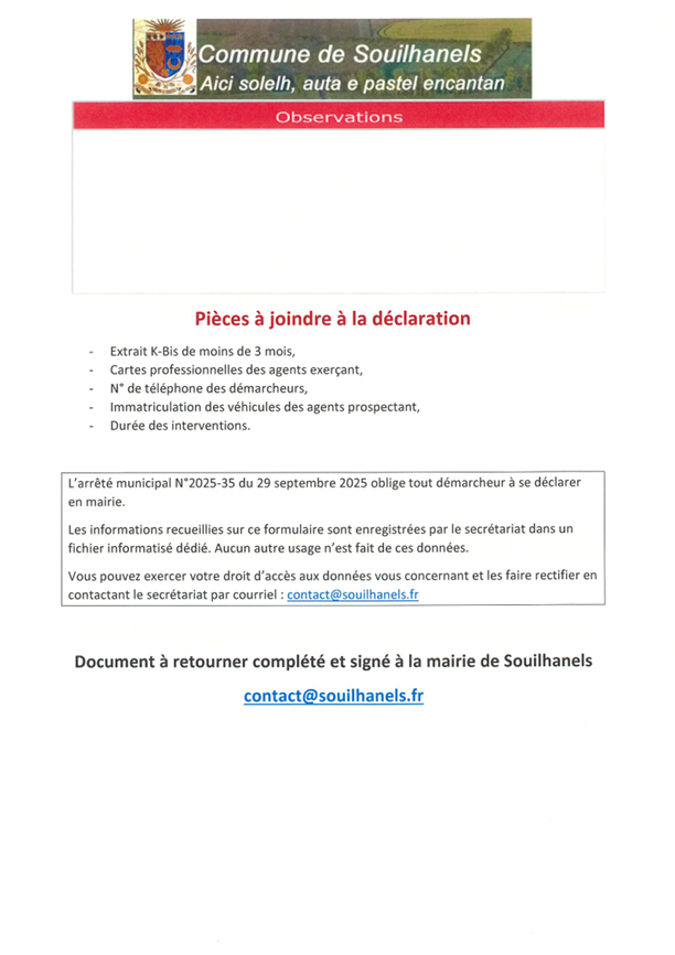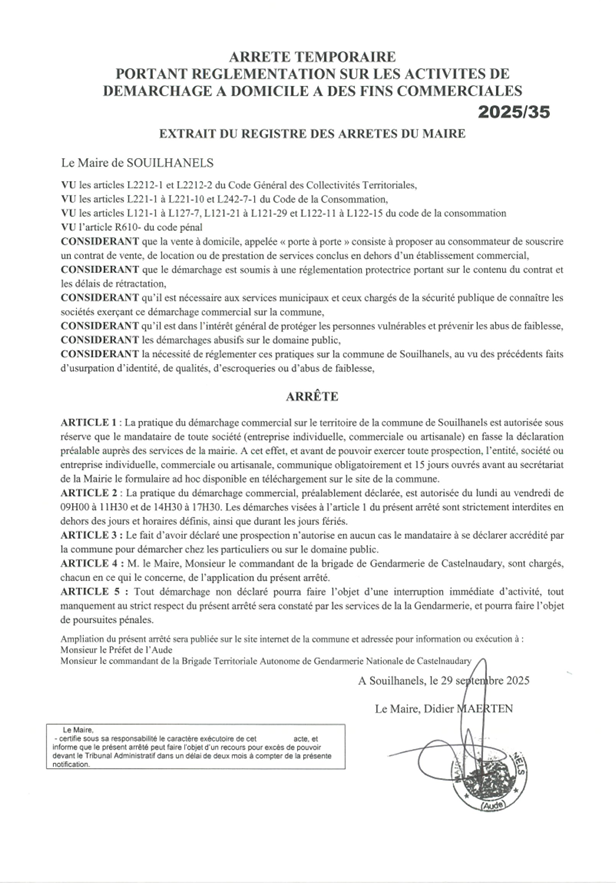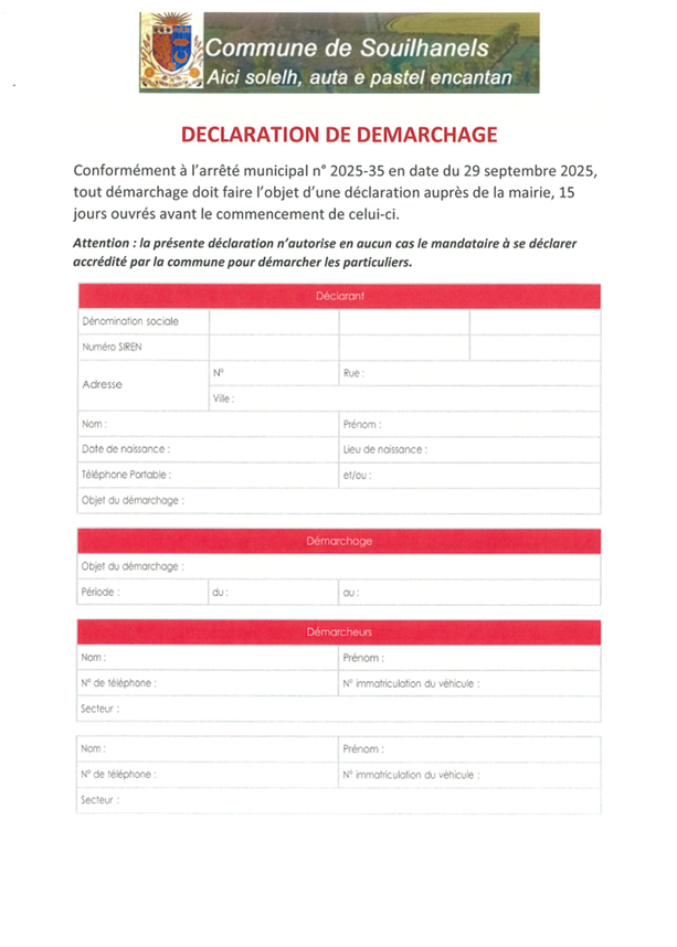 A compter de ce jour, l’arrêté municipal 2025/35 réglemente ce type de pratique sur la commune. Il est demandé aux entreprises ou à leur mandataire de compléter le formulaire ci-dessous, de le transmettre à la mairie afin d’informer le Maire de toute démarche auprès des habitants.