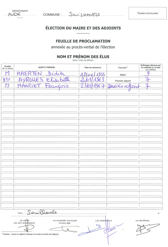 Veuillez trouver ci-dessous la feuille de proclamation des résultats pour la commune de SOUILHANELS :